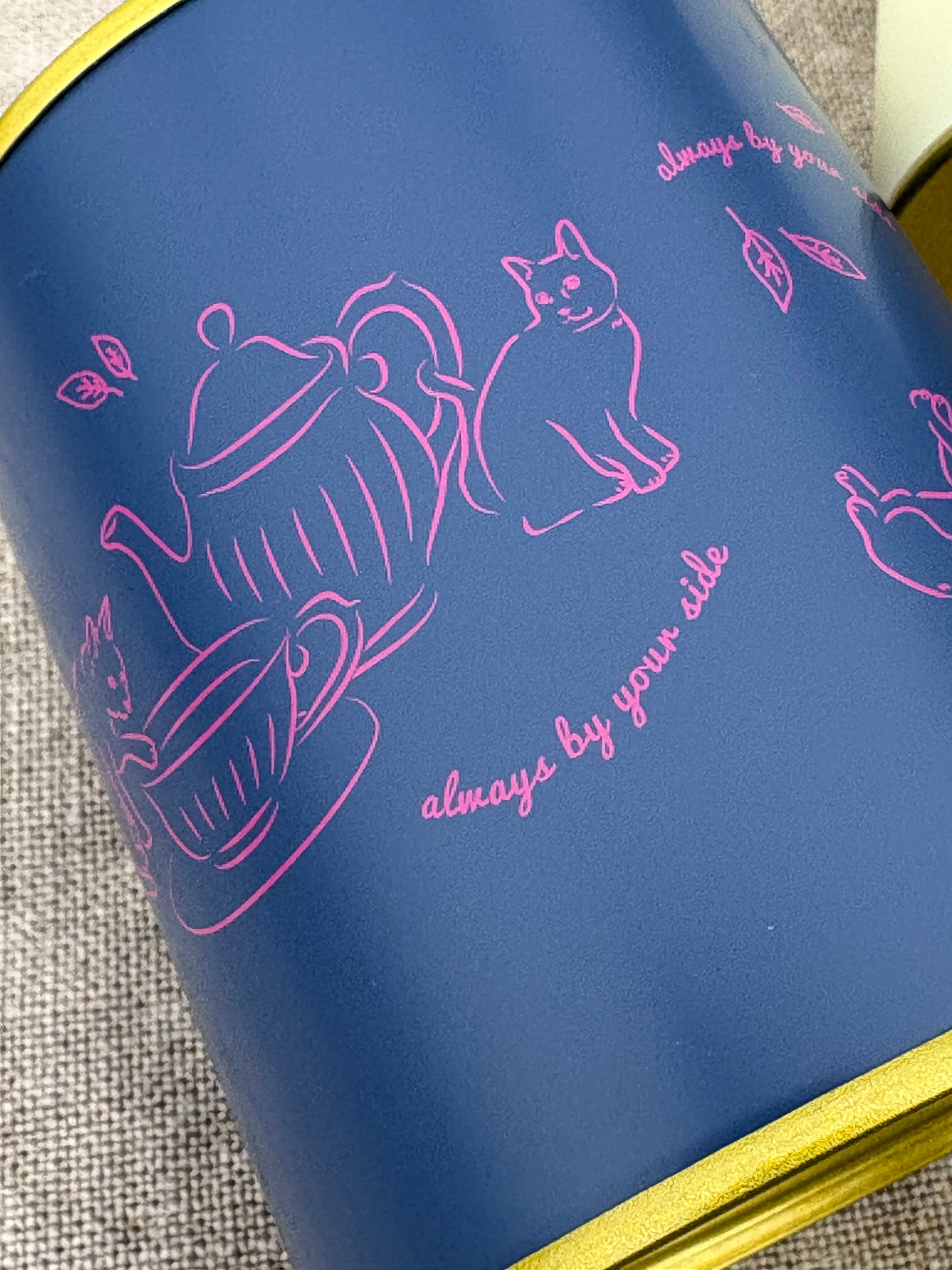 紺色の缶に可愛らしいピンクの猫ちゃんたちとティータイムをお楽しみください